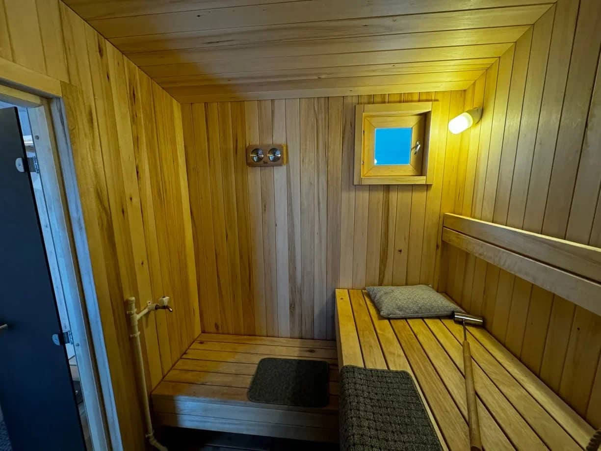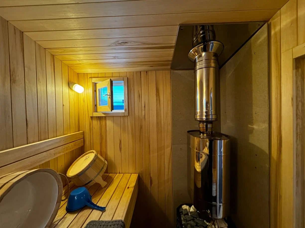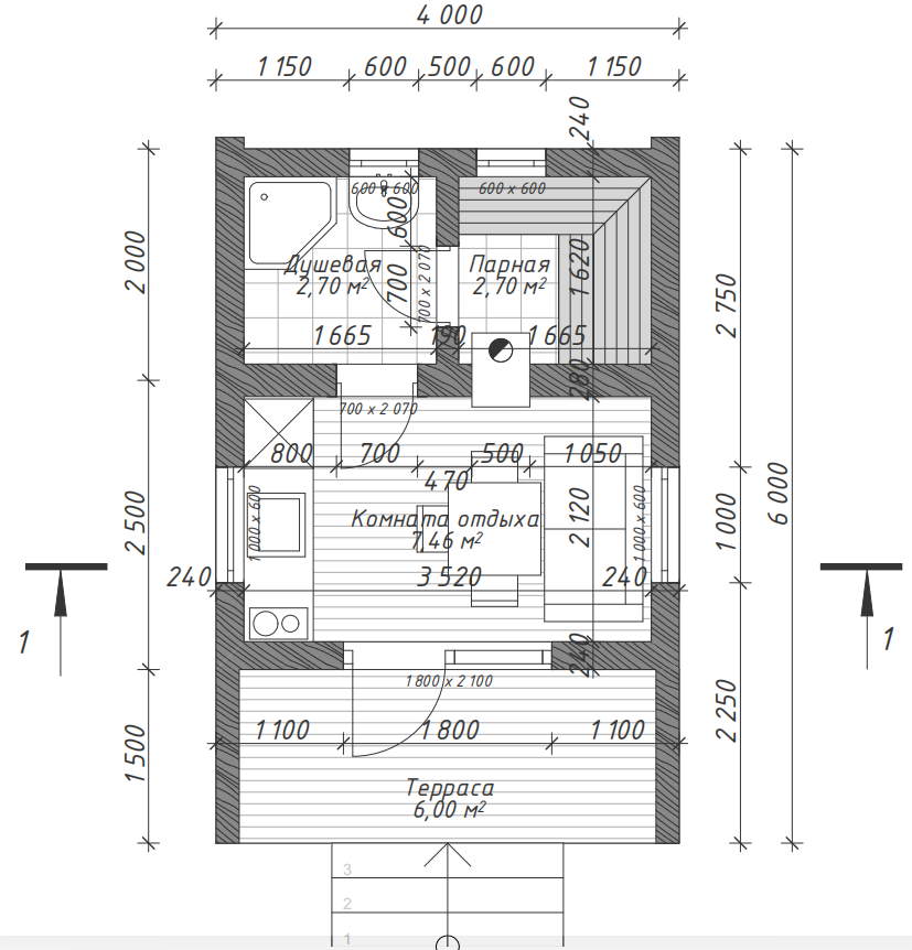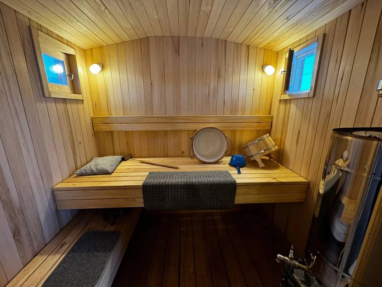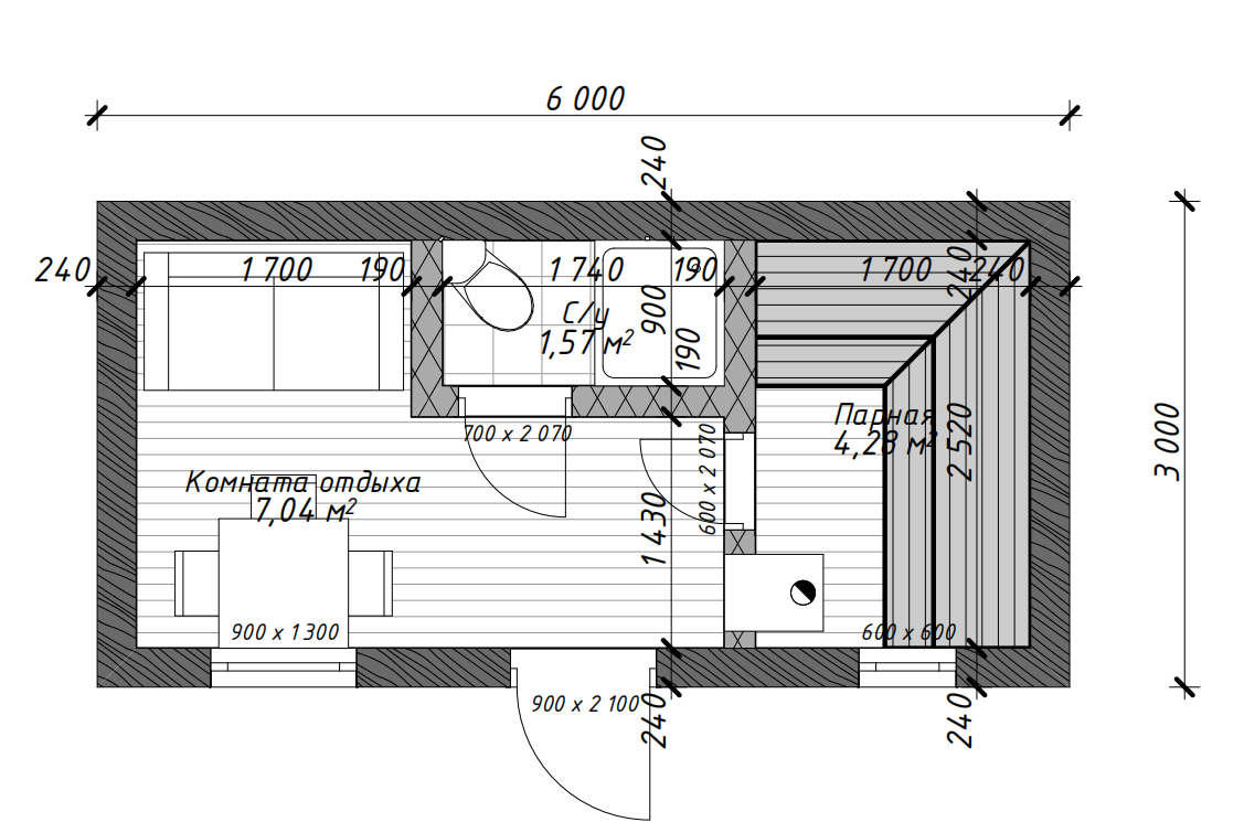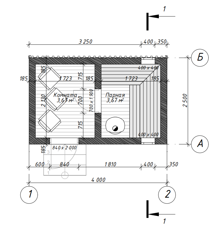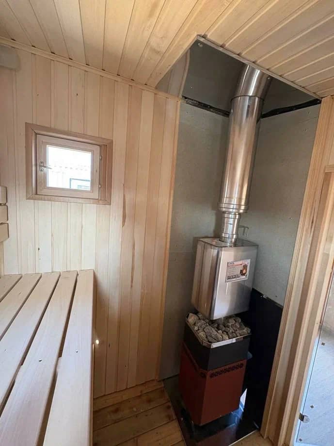 Комната отдыха: стены — имитация бруса хвойных пород дерева (сорт АВ); потолок — вагонка штиль хвойных пород дерева (сорт АВ). Парная: стены и потолок — липа (сорт экстра).