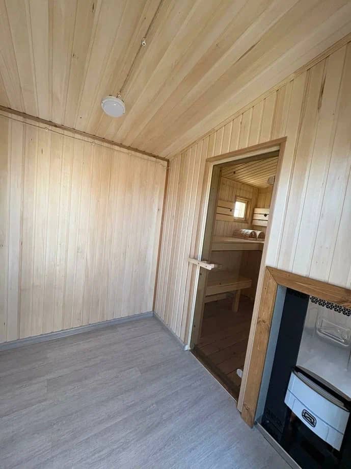 Комната отдыха: доска шпунт хвойных пород дерева. Помывочное и парное отделение: доска лиственница.